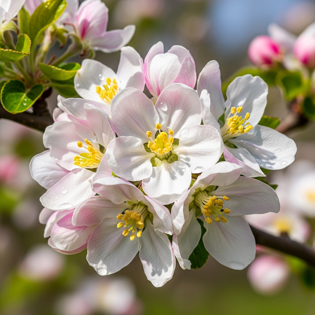 An apple blossom is the fragrant and showy flower produced by the domestic apple tree, scientifically known as Malus domestica. These beautiful blooms are typically white, often featuring a subtle pink tinge that gradually fades over their lifespan. Each apple blossom usually measures between 1 to 1.5 inches in diameter and showcases five distinct petals arranged around a cluster of numerous stamens. They appear in clusters, commonly referred to as cymes, which typically contain four to six individual flowers.